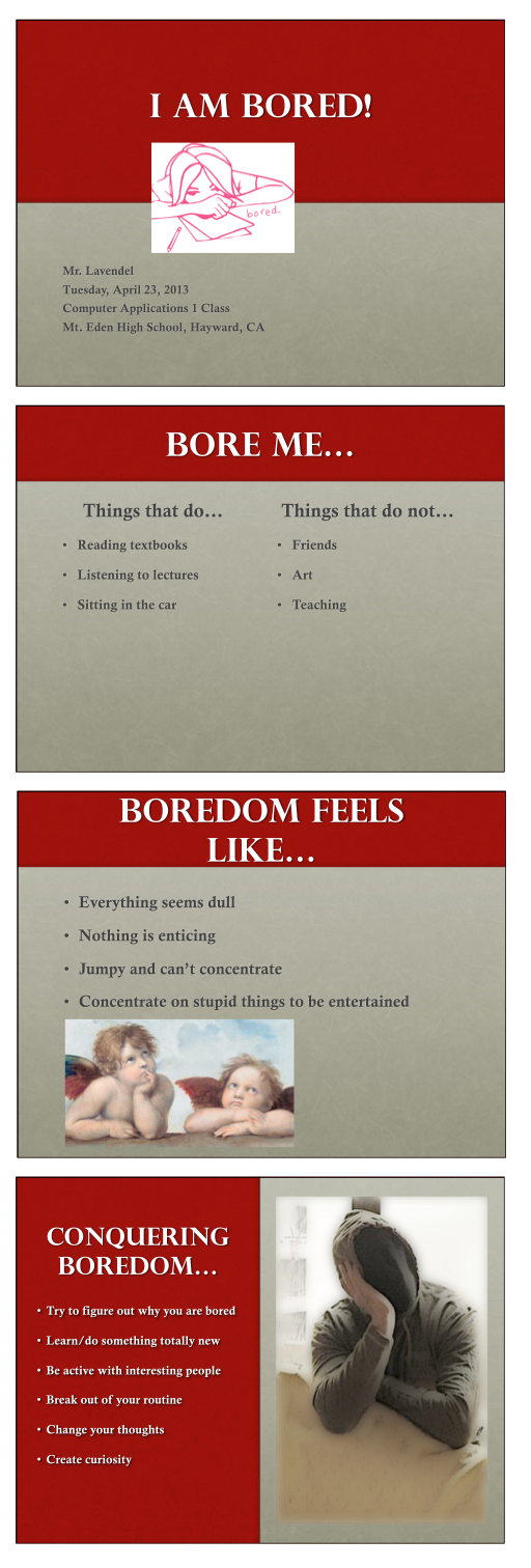Use the PowerPoint that you began earlier in class about boredom, or start a new one. Expand on it to include 4 slides total: